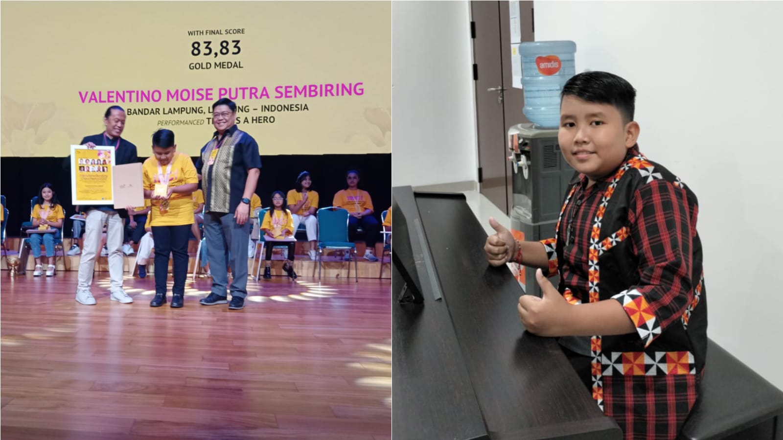 Valentino Moise Putra Sembiring siswa kelas 6 SD Xaverius 3, Way Halim, Bandarlampung berhasil meraih medali emas di International Bandung Choral Festival 2023, Jumat (10/11). Moise berhasil meraih skor 83.83 dan tergabung dalam Gita Nada Lampung Choir (GNLC). Kompetisi ini sendiri diikuti oleh sembilan negara terdiri Indonesia, Philippine, Malaysia, Cambodia, Thailand, USA, Singapore, Sri Lanka, Austria.