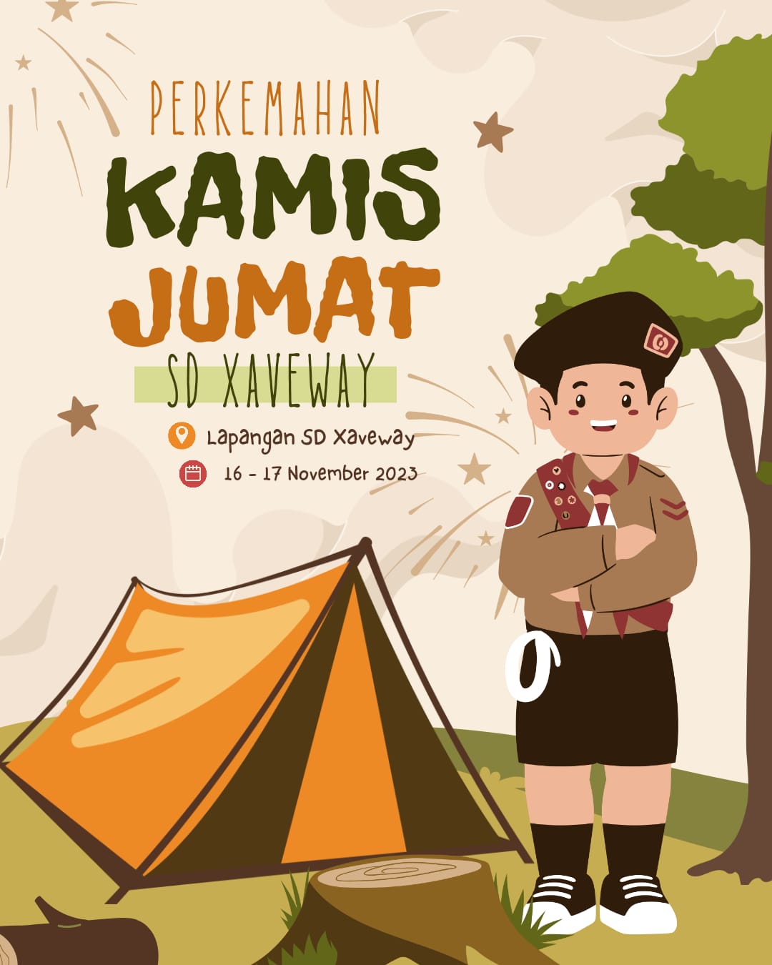 Kegiatan Perkemahan Pramuka Kamis – Jumat SD Xaverius 3 Bandar Lampung dilaksanakan pada 16-17 November 2023 di SD Xaverius 3 Bandar Lampung.